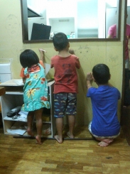 【写真は、卒園をした私の子供たち!!壁をキャンパスに一生懸命お絵かき中・・・】