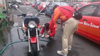 バイク指導員への練習の第一歩が・・・『洗車』です。自動車もバイクも運
