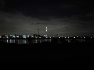 河川敷なので、街灯も無く前がほとんど見えない状況でしたが、いつも夜でも街灯が煌々と明るく光る道を走っているので、真っ暗な道は、