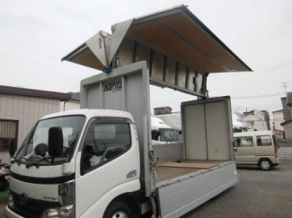 ↑写真のトラックは、最もポピュラーで箱の側面と天井部分が左右に開き羽みたいな形になるので『ウィングボディー』といいます。