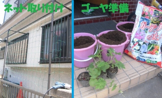 次にゴーヤの準備です(写真右)!!ゴーヤを植える際プランターは深い形の物が良いのですが、深型のプランターは高いので100均で買った