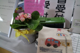 明日の勤労感謝の日を前に近くの小学生たちがかわいいお花とかわいい巾着袋をプレゼントしに来てくれました。