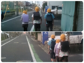 写真(下)のように縦一列で道路の端を歩いている子供もいれば、写真(上)のように横に広がって話に夢中になりながら歩く子供たちもいます。