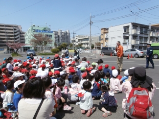 その最終日の今日は、近くの保育園総勢200名弱の子供たちに集まってもらい交通安全教室を実施いたしました。