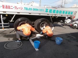 2人には、普段なかなかかかわる機会が少ない大型トラックの清掃、点検をしてもらい、トラックの大きさにびっくりしていた様子でした(*^ワ^*)