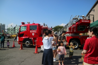 このイベントには平和橋教習所に力を貸してくれる様々な企業さんが、いろいろなのりものを持って来て運転したり乗ったりできるとっても楽しいイベントなのですが、はしご車搭乗体験も大人気です。