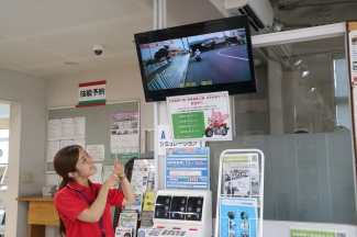 そんな二輪教習では、教習最後のみきわめの時に決められたコースを走っていただくのですが、今までは教習で繰り返しコースを走って覚えたりみきわめコースの順路を示した地図をお配りしていましたが、先週からみきわめコースを映像で見れるようにロビーにモニターを設置してコース走行を公開しております。